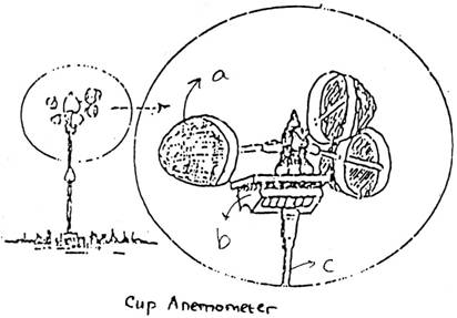 - Cup Anemometer. Alat ini untuk mengukur kecepatan angin rerata, bekerja pada prinsip system mekanik gir. Adapun satuan pengamatan yang digunakan menggunakan km/jam. Cup anemometer ini digunakan untuk pengamatan harian yang dipasang pada tiang atau menara. Kelebihannya adalah hasil pengukurannya dapat mewakili angin sampai ketinggian 10 m dari tanah jika tidak penghalang. Namun kekurangan dari alat ini adalah penempatannya yang di atap bangunan akan menghasilkan pengukuran yang kurang akurat.
