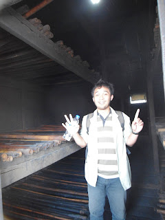 Menggandeng gedung RSS adalah gedung pengasapan yang terdiri dari dua lantai. Ada banyak ruangan gelap gulita yang sunyi senyap di sini berisi bambu-bambu untuk menggantung orang eh maksudnya lembaran lateks. Lembaran lateks yang masih segar berwarna putih susu, setelah kering warnanya menjadi cokelat kehitaman dan berbau menyengat karena pengasapan. Pengasapan dilakukan selama satu minggu dengan peningkatan suhu secara pertahap. Panas dalam ruang pengasapan dihasilkan dari pembakaran kayu karet dalam tungku raksasa yang ada di lantai dasar. Kayu karet dipilih karena baunya yang relatif tidak terlalu menyengat dibandingkan dengan kayu lainnya. Dalam satu hari biasanya pengasapan ini dapat memakan 3-4 meter kubik kayu karet. Banyak banget ya.. Kami bersyukur tidak berkunjung ke sini malam hari. Ngeri.. di samping gedung pengasapan yang gelap gulita dan sunyi senyap ini ada sebuah gedung tua yang tinggi dan diselimuti rumput-rumput menjalar. Entah mengapa gedung itu ada di sana.