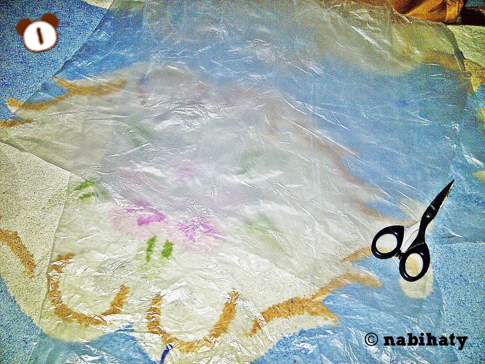 - Gunting plastik pembungkus kertas fotokopi sehingga membentuk lembaran lebar. Dalam tahap ini kamu juga bisa berkreasi jika ingin membuat pola-pola cantik di atasnya, bisa dilakukan dengan melubangi plastik mengikuti pola atau melukis di atas plastik dengan tinta timbul yang bisa kamu beli di sini.