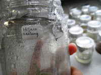 Gambar 1. Botol pembudidayaan disegel rapat untuk menjaga kondisi aseptik di dalamnya. Obyek foto berada di dalam botol, tidak boleh dikeluarkan begitu saja. - Tempat pengambilan gambar biasanya adalah ruang inkubasi yang mendapatkan intensitas pencahayaan tinggi (biasanya sekitar 1000 lux) dari segala sisi, sehingga sulit untuk menentukan arah datangnya cahaya.